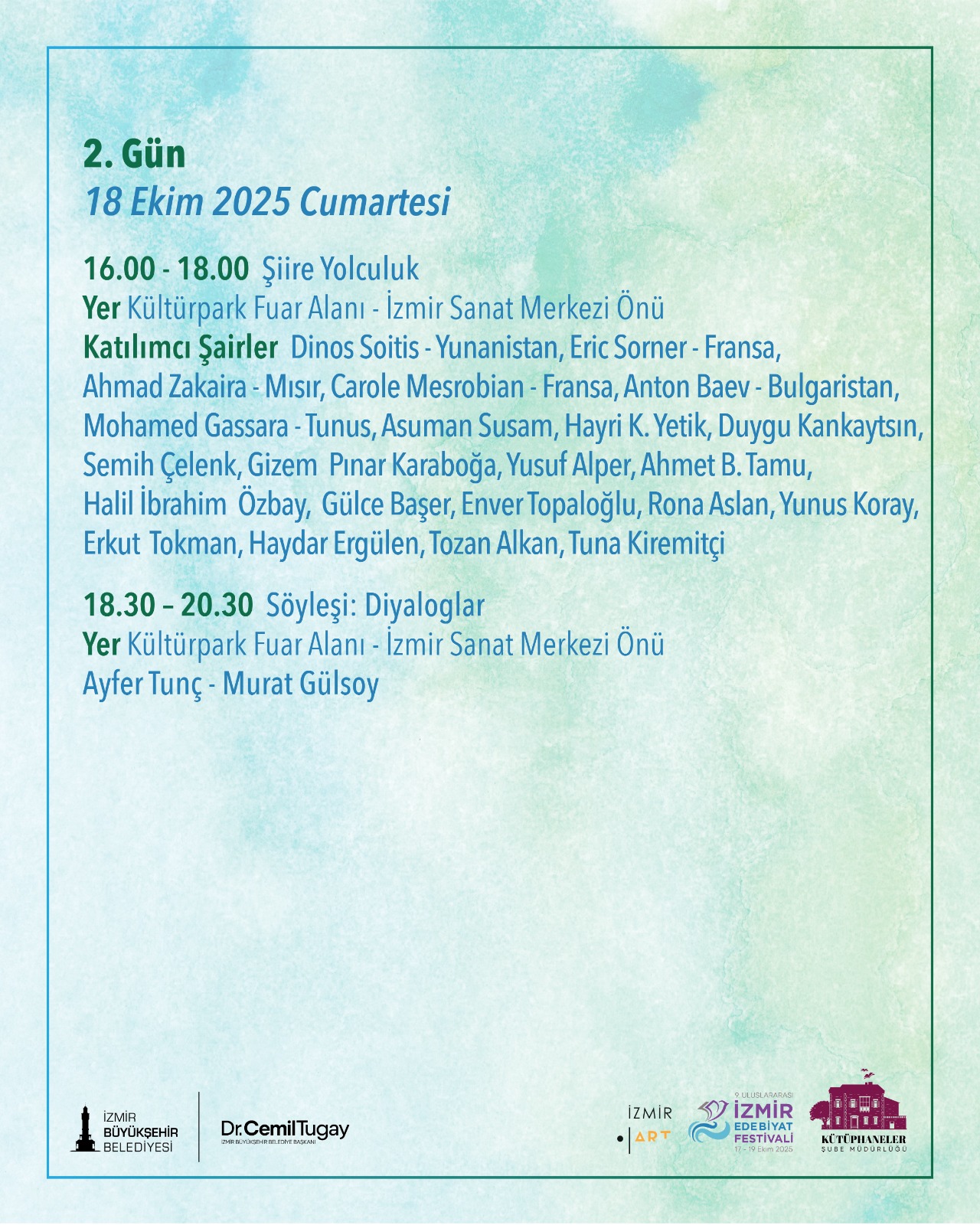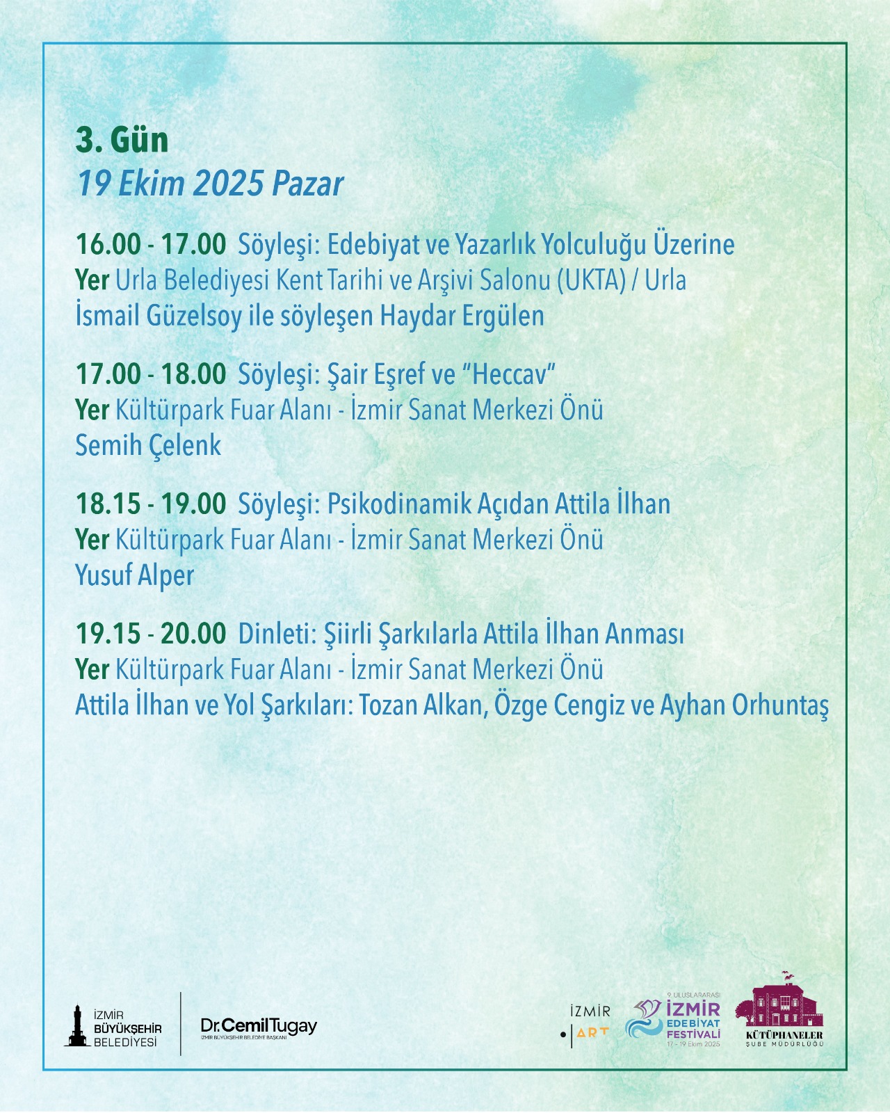 Etkinlikler, Kültürpark ile sınırlı kalmayacak. Urla Belediyesi Kent Tarihi ve Arşivi Salonu, Güzelbahçe Belediyesi Kültür Merkezi ve Bornova Belediyesi Nevzat Kavalar Kültür Merkezi gibi kent genelindeki mekanlarda paneller, söyleşiler ve atölyeler düzenlenecek. Böylece festival, İzmir’in farklı noktalarında yurttaşlara edebiyatın izlerini sürme fırsatı sunacak.