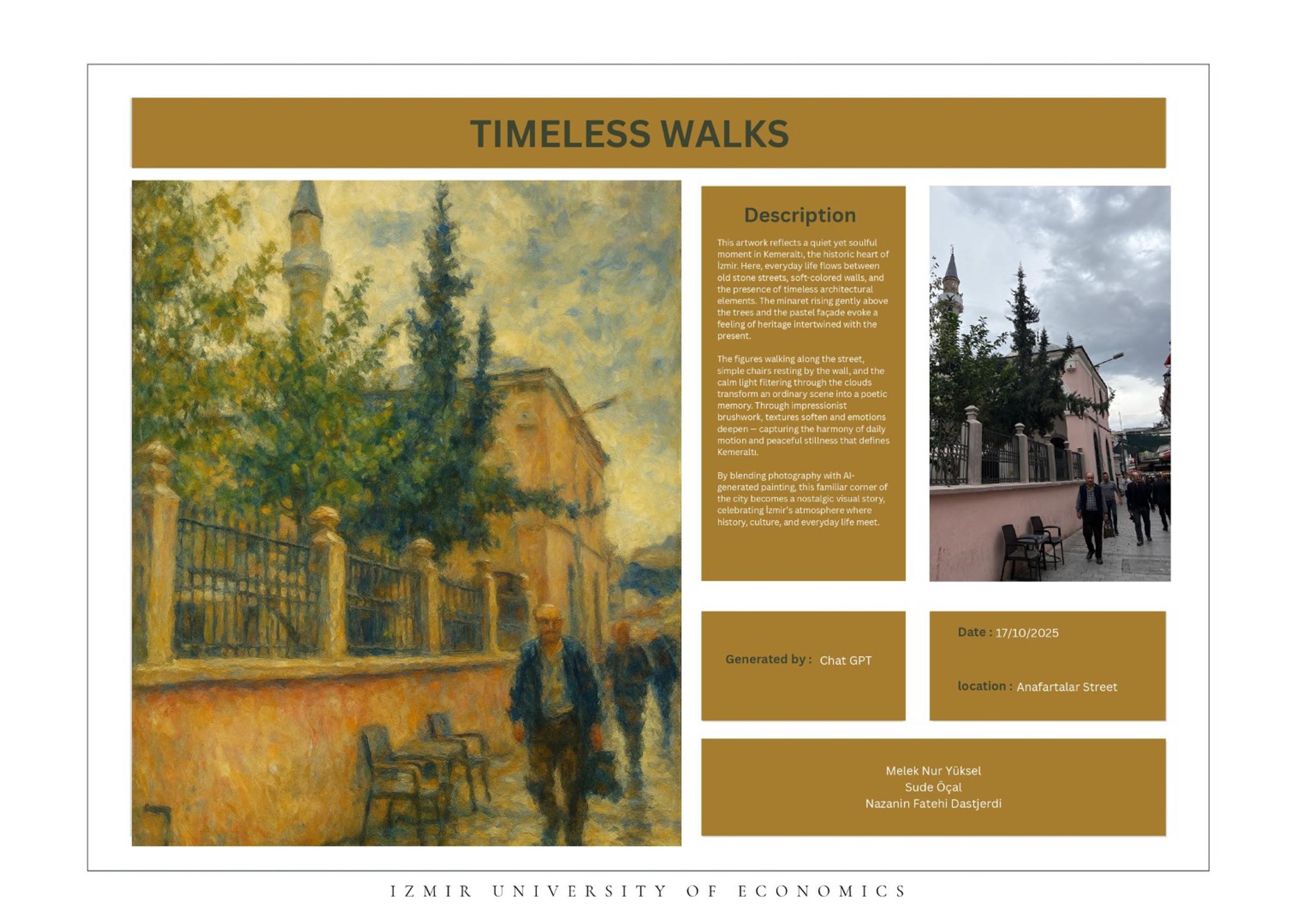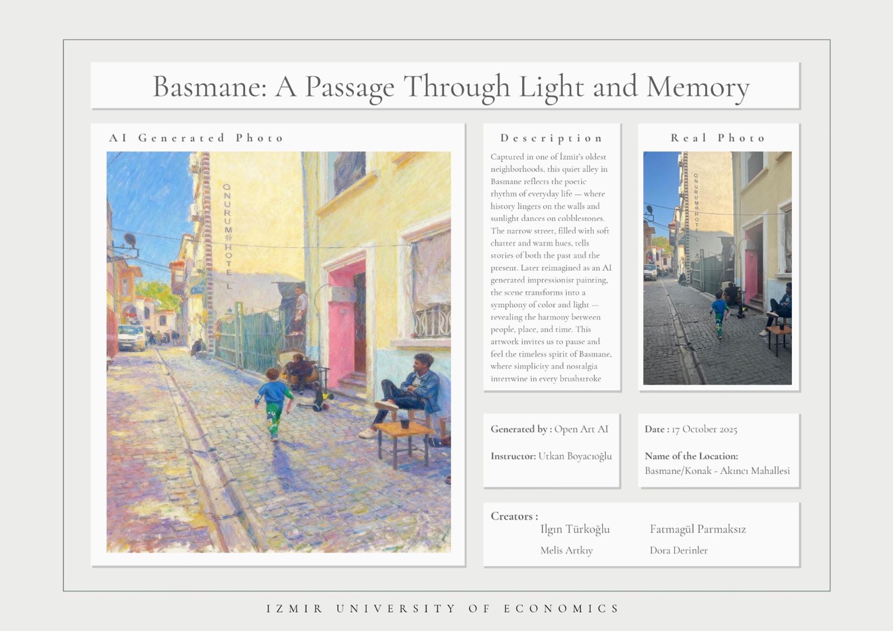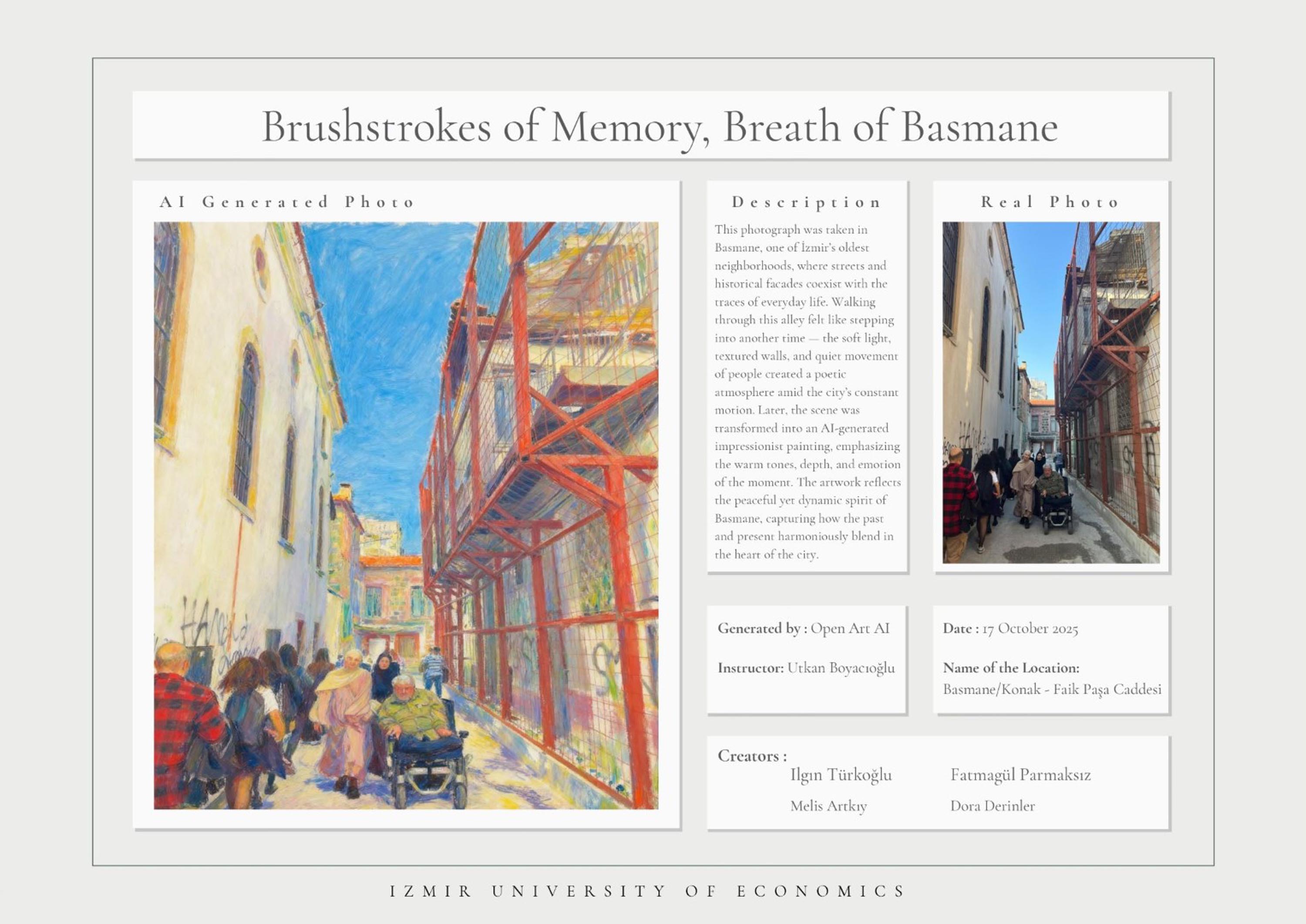 Anafartalar Caddesi, Kadı Hamamı, Mavi Kortejo, Hatuniye Camii, Dönertaş Sebili, Kadın Müzesi & Sanathane, Fettah Camii & Mısri Dergahı, Altınpark kazı alanı, Kumrulu Mescit, Aziz Vukolos Kilisesi, Bıçakçı Han & Yıldız Sineması, Basmane Garı gibi kentin tarihi noktalarını gezen 41 öğrenci, bu bölgelerdeki yaşamı gözlemleyip fotoğrafladı. İzmir Ekonomili gençler, ardından da bu fotoğrafları yapay zeka destekli sanat araçlarıyla tabloya dönüştürerek birer özgün sanat eserine imza attı.