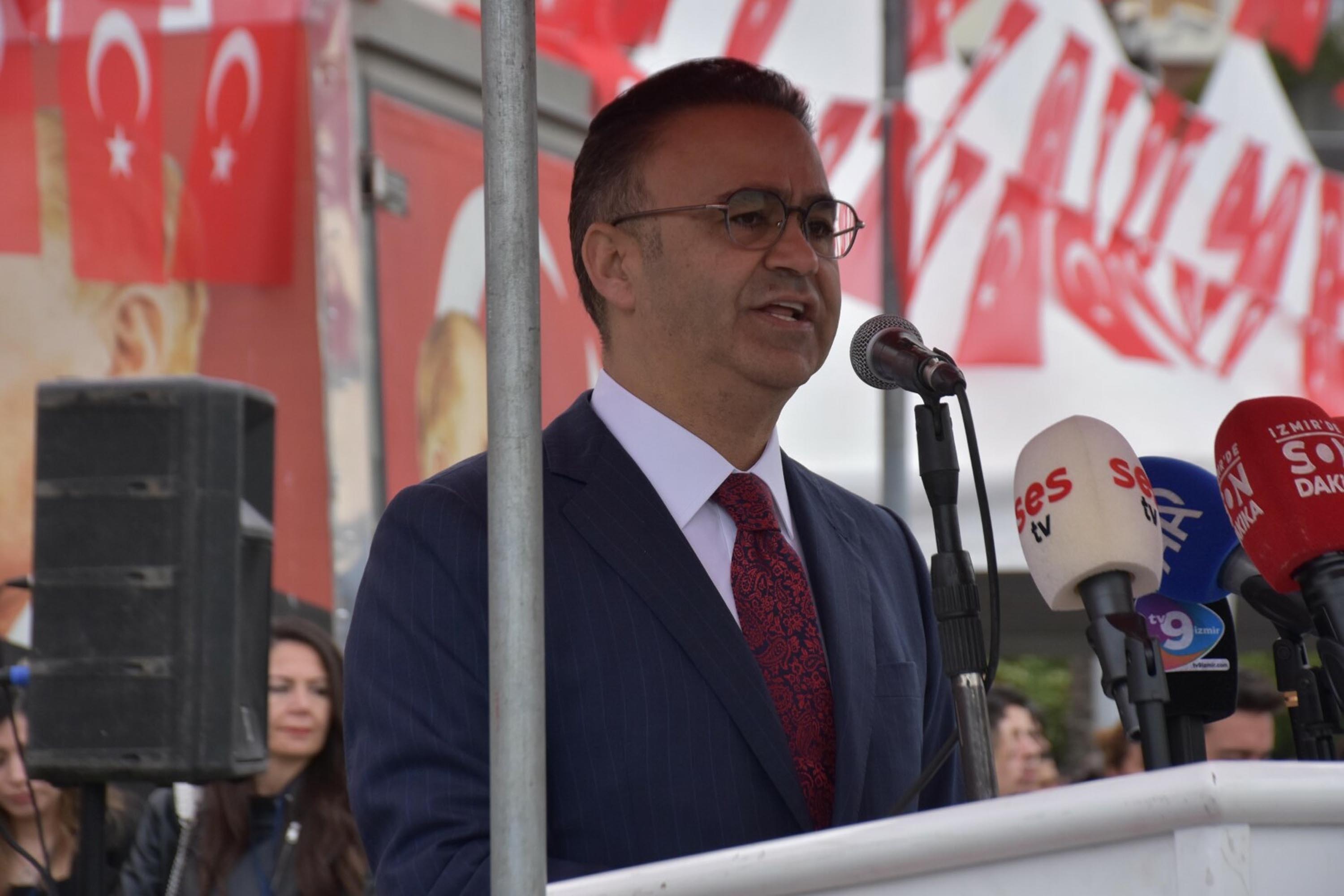 Kutlama programı kapsamında İzmir İl Milli Eğitim Müdürü Ömer Yahşi bir konuşma yaptı. Yahşi, törende yaptığı konuşmada, "Uğruna emsali görülmemiş bedeller ödenen bu mukaddes vatan toprağının her karışında kahraman ecdadımızın hayalleri, rüyası, duası var. Milletçe yüreğimizi aynı yerden sızlatan büyük bir acının içinden geçtiğimiz bugünler, kalplerimizde derin bir iz bırakırken evlatlarımıza dair mesuliyetimizi daha da derinleştirmektedir. Bu millet, en çetin zamanlarında dahi evlatlarını istikbalinin teminatı görmüş, onları yetiştirmeyi ve korumayı asli vazifesi bilmiştir. Bu topraklar nice badireler atlattı. Her seferinde en sağlam cevabını aklıyla, irfanıyla ve maarifiyle verdi. Bizler, büyük Türk milleti olarak hiçbir zaman korkunun, zulmün, karamsarlığın veya yılgınlığın tarafı olmadık. İnancın, azmin, sabrın ve istikbali inşa ve imar eden sarsılmaz bir iradenin safındayız. Bu yüzden 23 Nisan, yalnız bir bayram değil, bir milletin en çetin zamanlarda dahi evlatlarına duyduğu güvenin ifadesidir. Gazi Mustafa Kemal Atatürk’ün bu kutlu emaneti, yarınlarımızın asıl menzili olan evlatlarımıza bayram olarak armağan etmesi, asla tesadüf değildir. Onun ‘Türk çocuğu ecdadını tanıdıkça daha büyük işler yapmak için kendinde kuvvet bulacaktır’ sözüyle tasavvur ettiği nesil, güzel ülkemizi yıldızlara taşıyacaktır. Çocuklar, sizler, aziz vatanımızın en kıymetli cevheri, en büyük sermayemiz, kolumuz kanadımız gayretimiz, sınırsız hayallerimizsiniz. Güzel ülkemizin hikayesini dünyaya anlatacak olan sizlersiniz. Rüyalar sizin, yarınlar sizin, bu şanlı bayrak sizin. Bu cennet vatan, bu topraklar bu Cumhuriyet sizin. Bir gün yorulursanız başınızı kaldırın ve ay yıldızlı bayrağımıza bakın. O bayrak dalgalandıkça asla yalnız değilsiniz. Arkanızda şanlı bir tarih, yanınızda milletimizin duası, önünüzde muazzam bir istikbal. Yolunuz açık, ufkunuz engin, geleceğiniz aydınlık olsun." dedi.
