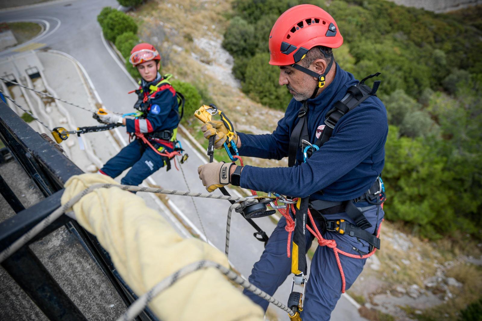 Eğitim Çavuşu Mesut Topal ise 15 metre yükseklikteki kuleden iple erişim tekniklerini anlattı. Topal, “Mesleğe yeni başlayan itfaiyeci arkadaşlarımıza basit istasyon kurulumu, yük dağılımı istasyon kurulumu, kullandığımız iplerin özellikleri hakkında eğitim veriyoruz. Teorik eğitimlerin ardından uygulamaya geçiyoruz. 15 metrelik kuleden aşağıya seri şekilde iniş ve tekrar yukarı tırmanma pratiği yapıyoruz. İpte asılı kalmış kişileri kurtarma, vadide, uçurumda, kuyularda kurtarılmayı bekleyen insanları, hayvanları kurtarma tekniklerini öğretiyoruz.