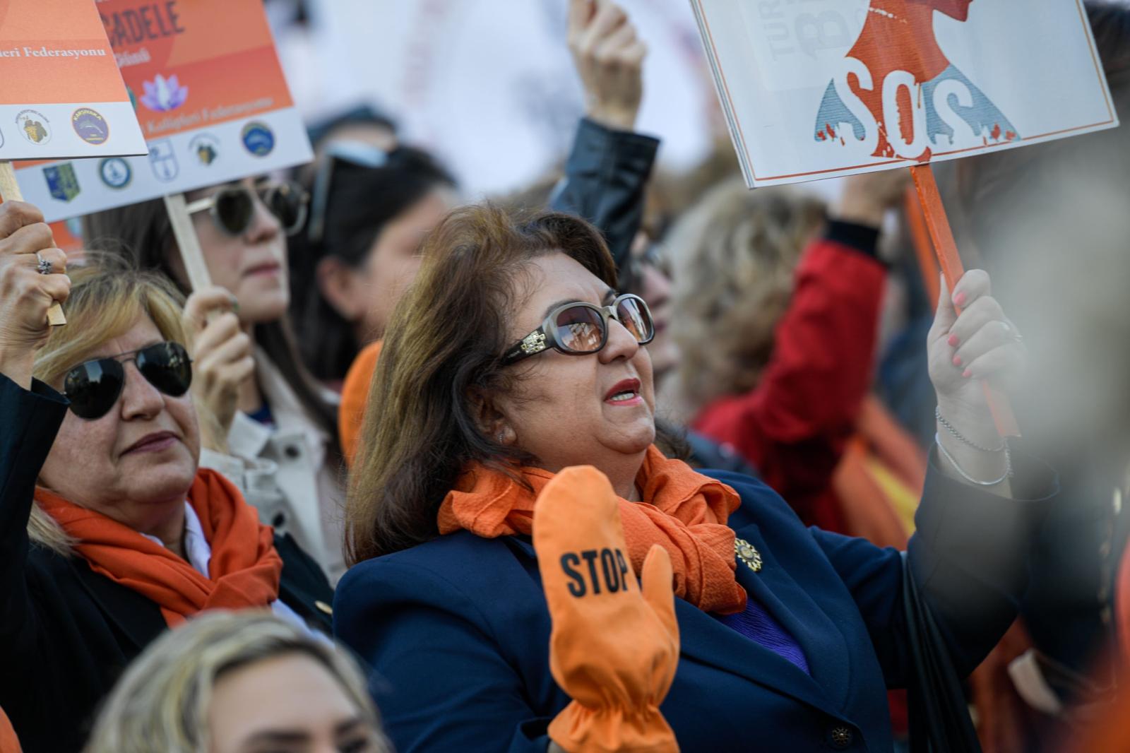Vatandaşlar, evlerinin balkonlarından sloganlarla korteje destek verdi. Yüzlerce “turuncu” kıyafetli kadın, Kültürpark’ın Lozan Kapısı girişinde alkışlarla karşılandı.