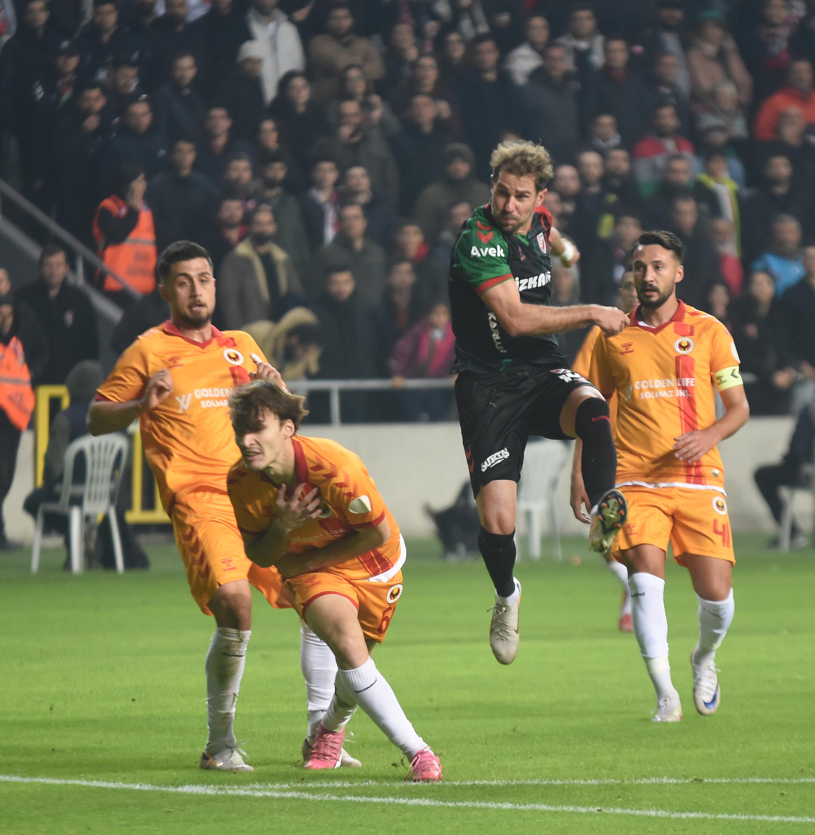 39'uncu dakikada Karşıyaka gole çok yaklaştı. Tolga'nın sağdan kullandığı kornerde Hamza'nın kafa vuruşunda top direkten döndü.