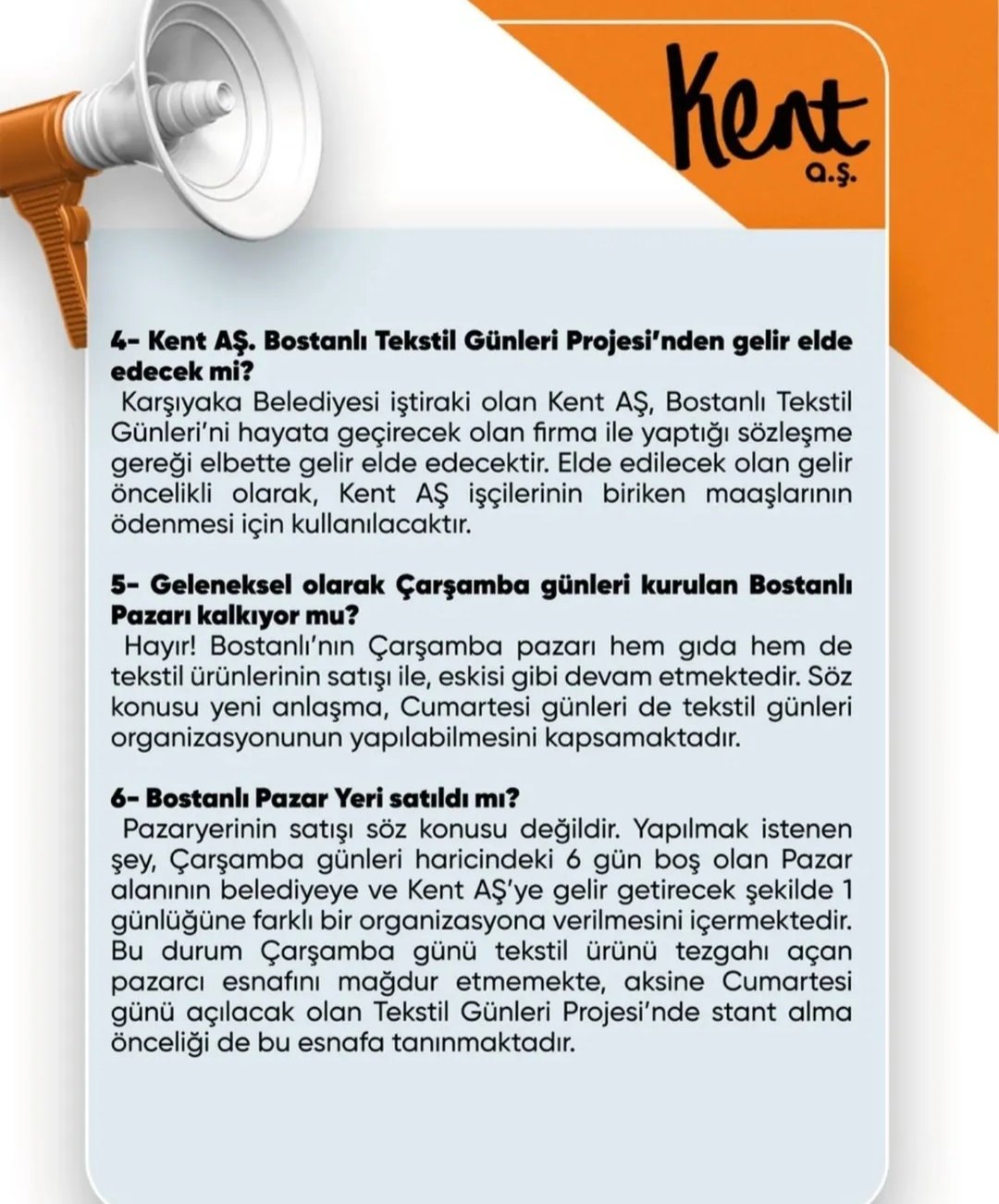 Bunun üzerine Karşıyaka Belediyesi iştiraki Kent A.Ş. Bostanlı Tekstil Günleri ile ilgili 6 maddelik açıklama ile kamuoyunu bilgilendirdi.