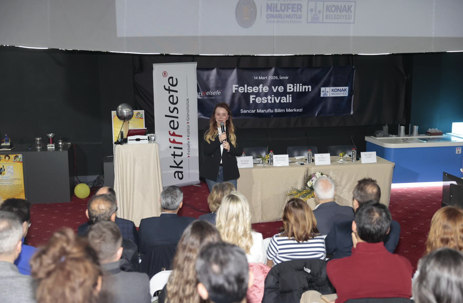 Konak Belediye Başkanı Nilüfer Çınarlı Mutlu, Aktiffelsefe Kültür Derneği iş birliği ile Sancar Maruflu Bilim Merkezi’nde düzenlenen Felsefe ve Bilim Festivali’ne katıldı. Yetişkinlere yönelik oturumların yanı sıra felsefi diyaloglar, belgesel gösterimleri, deney istasyonları ve çocuklar için atölye çalışmalarıyla her yaştan katılımcıyı ağırlayan festivalde konuşan Başkan Mutlu, “Sorgulayan, merak eden ve birey olma yolunda dogmalardan uzak çocuklar yetiştirmeyi hedefliyoruz” dedi.