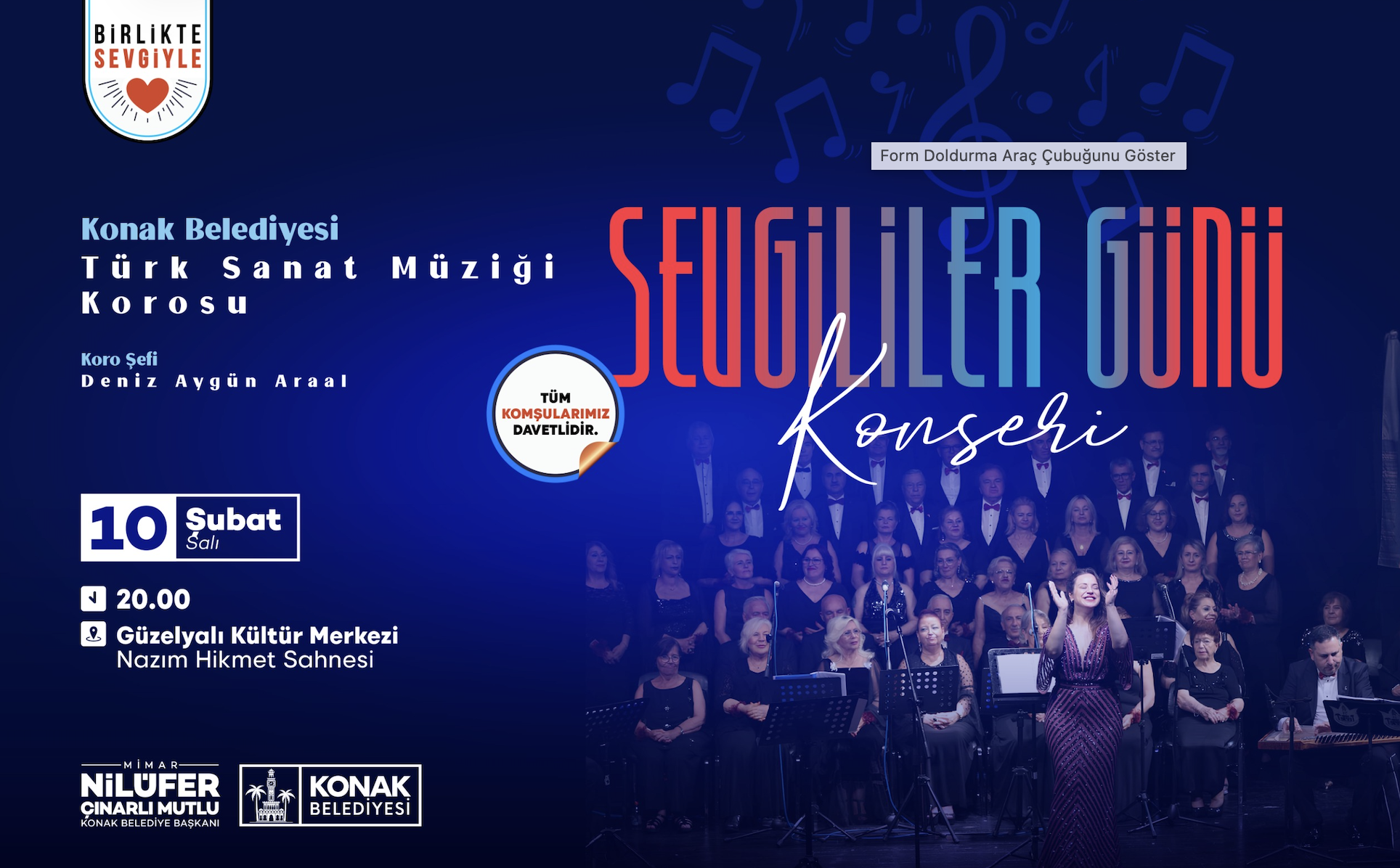 Sevgiyi emekle güçlendiren kermeste, cadde üzerine kurulacak sahnede konserden gösterilere birbirinden güzel etkinlikler de yer alacak. Öte yandan Konak Belediyesi’nin Güzelyalı Nazım Hikmet Kültür Merkezi, 10 Şubat Salı akşamı aşk şarkılarına ev sahipliği yapacak. Saat 20.00’de başlayacak muhteşem konserde Konak Belediyesi Türk Sanat Müziği Korosu, Şef Deniz Aygün Araal yönetiminde sahne alacak. Aşka ve sevgiye dair en güzel şarkılar, Konak’ta dile gelecek.