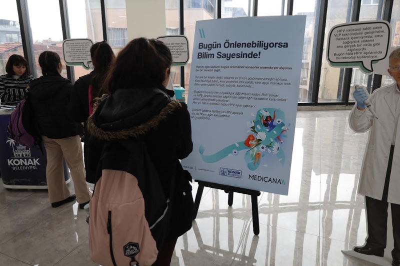 Rahim ağzı kanserine yönelik farkındalık oluşturmak ve bu hastalığa karşı mücadelenin yollarını anlatmak adına Konak Belediyesi Sağlık İşleri Müdürlüğü ve Medicana International İzmir Hastanesi iş birliğinde kapsamlı bir farkındalık çalışması gerçekleştirildi. ‘Bugün Önlenebiliyorsa Bilim Sayesinde’ başlığıyla rahim ağzı kanserine dikkat çekmek amacıyla Konak Belediyesi’nin Güzelyalı Nazım Hikmet Kültür Merkezi, Beştepeler Sosyal Tesisleri ve Toros Sosyal Tesisi’nde farkındalık alanları oluşturuldu.