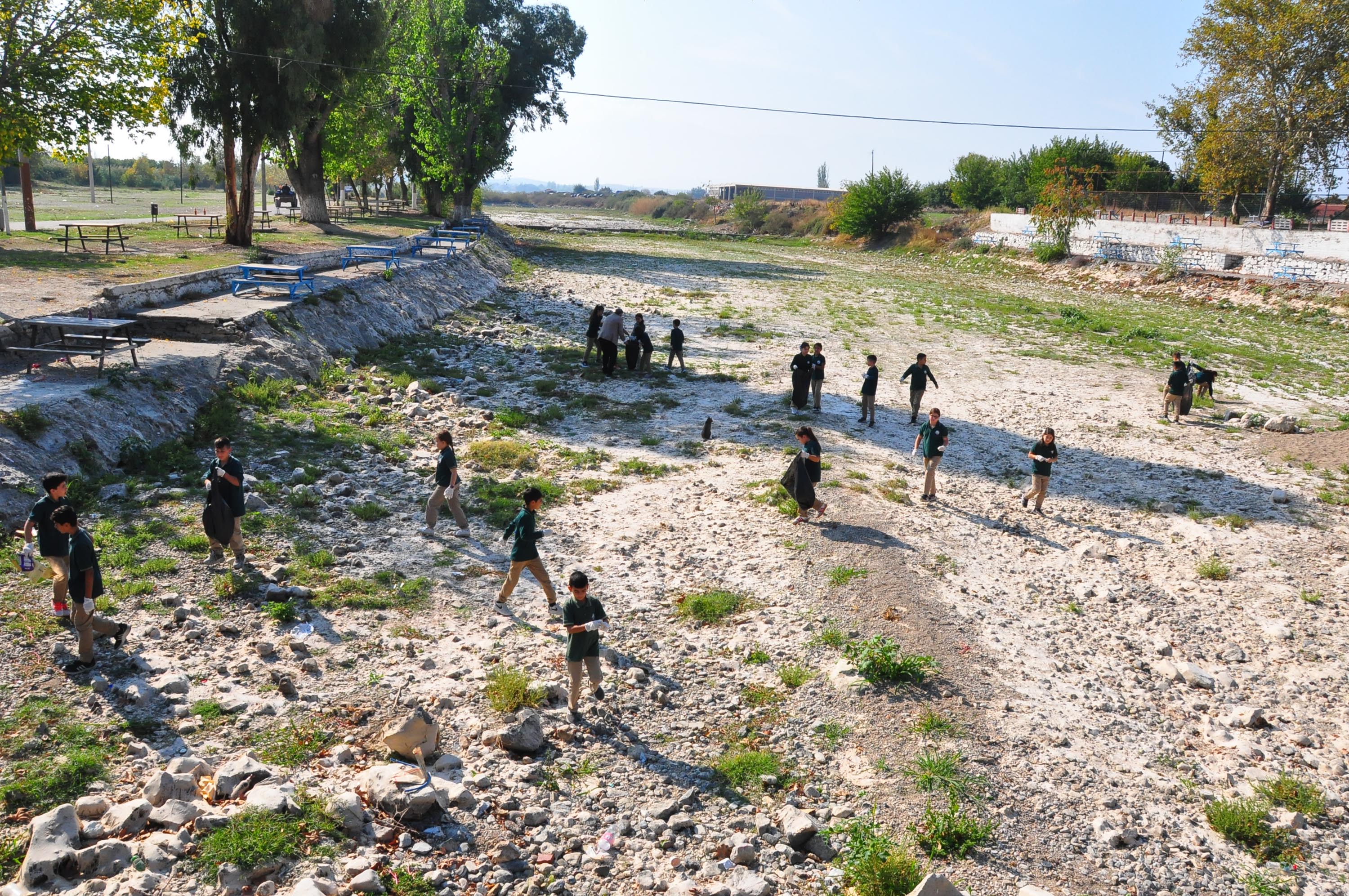 Öğrenciler, 'Çevreme Duyarlıyım, Değerlerime Saygılıyım' projesi kapsamında boş kalan nehir yatağına olta attı. Su olmamasına rağmen ellerinde oltalarla nehir kenarına dizilen öğrenciler, kuraklığın etkilerini sembolik bir şekilde gösterdi. Ardından nehir yatağında çevre temizliği yapan öğrenciler, etkinliğin sonunda Demirköprü Barajı çevresindeki ormana fidan dikti.