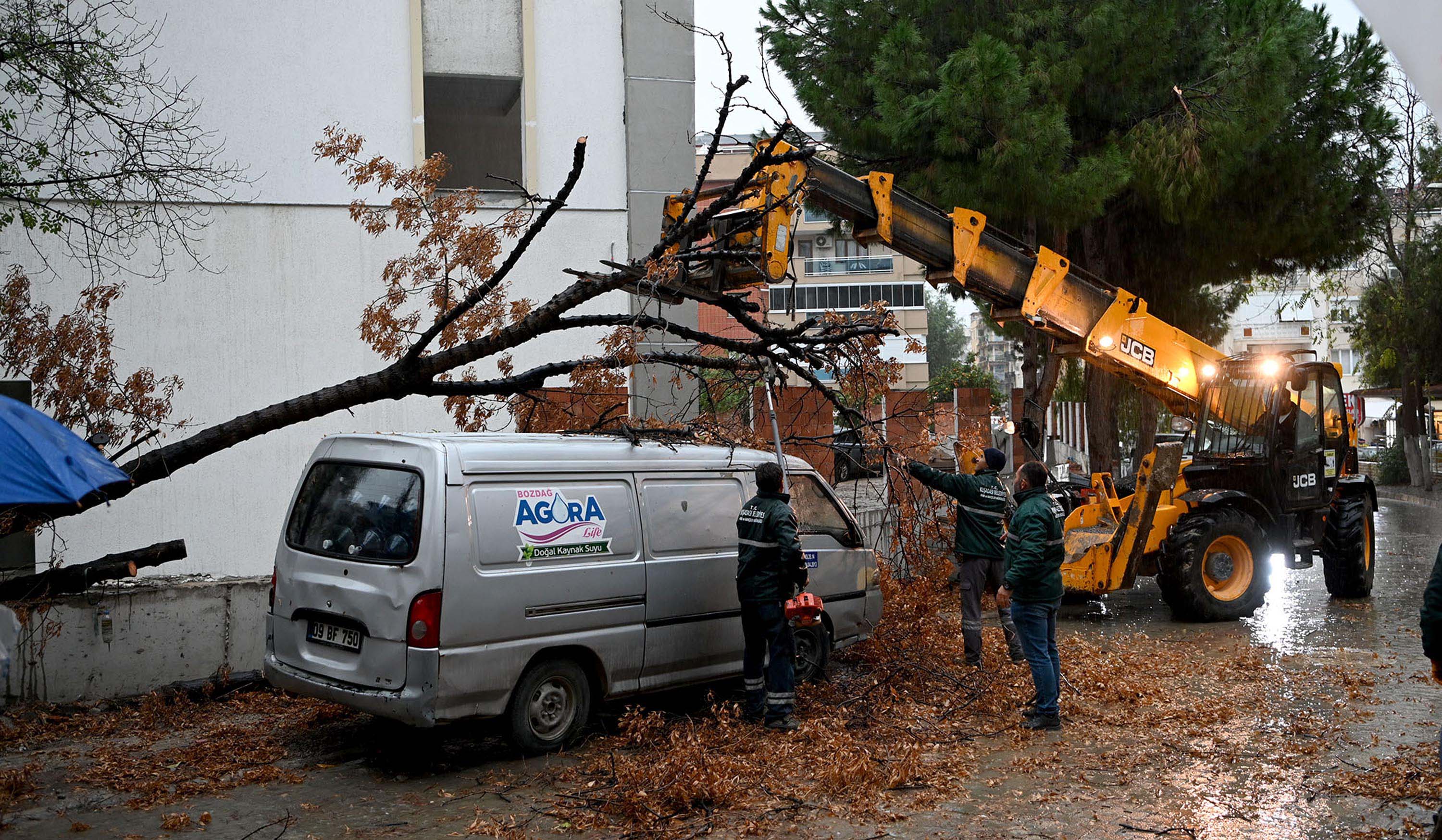 Kuvvetli rüzgar nedeniyle bazı mahallelerde yollara ve araçların üzerine devrilen ağaçlar belediye ekipleri tarafından kaldırıldı.