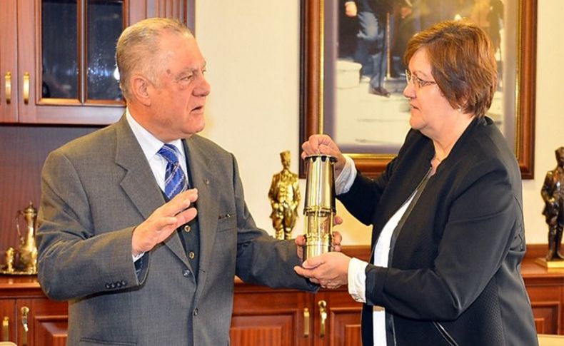 Ruhr Birliği Bölge Direktörü Karola Geiss Netthöfel, Başkan Vekili Dr. Sırrı Aydoğan’a, bir zamanlar madenlerin çok yoğun faaliyet gösterdiği bölgelerinde kullanılan madenci feneri hediye etti.