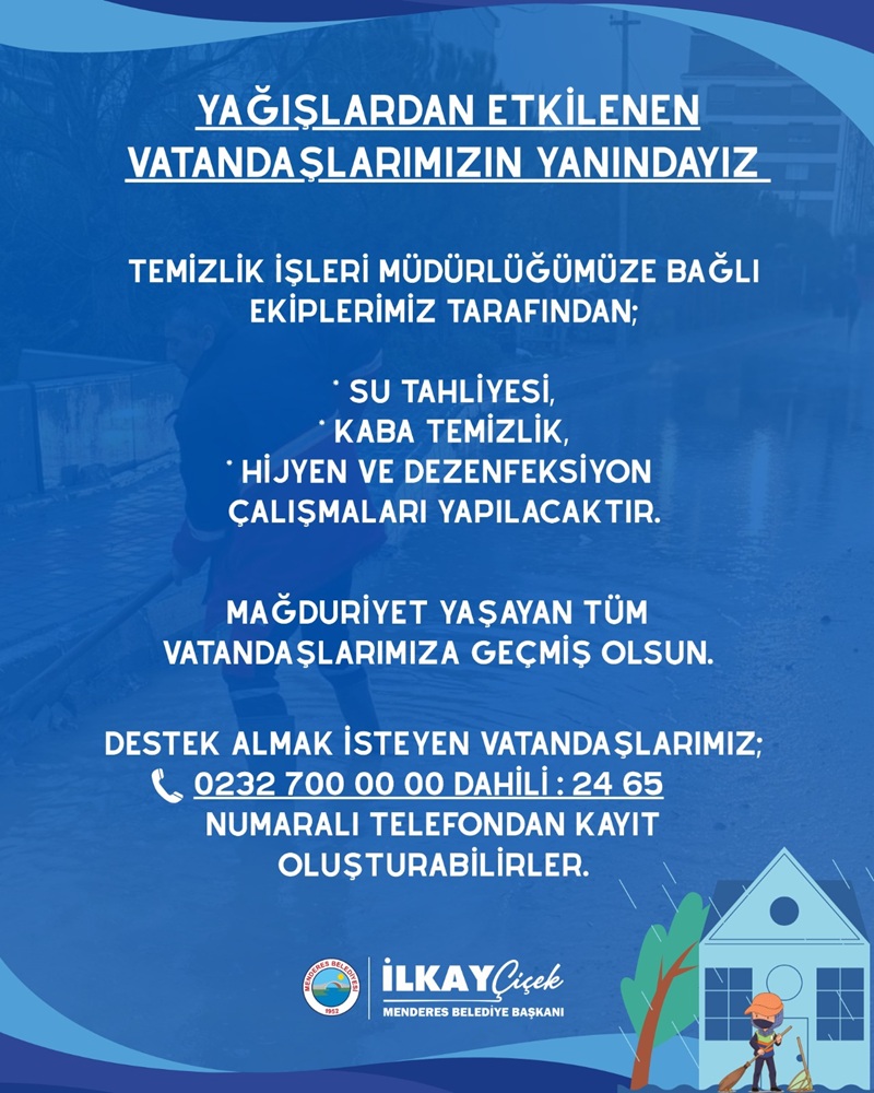 İzmir genelinde yaşanan aşırı yağışlar hayatı olumsuz yönde etkilerken Menderes Belediyesi tarafından ilçede mağduriyet yaşayan vatandaşlara destek geldi. Menderes Belediyesi Temizlik İşler Müdürlüğü tarafından gerçekleştirilecek çalışma ile su baskını yaşanan evlerde temizlik gerçekleştirilecek.