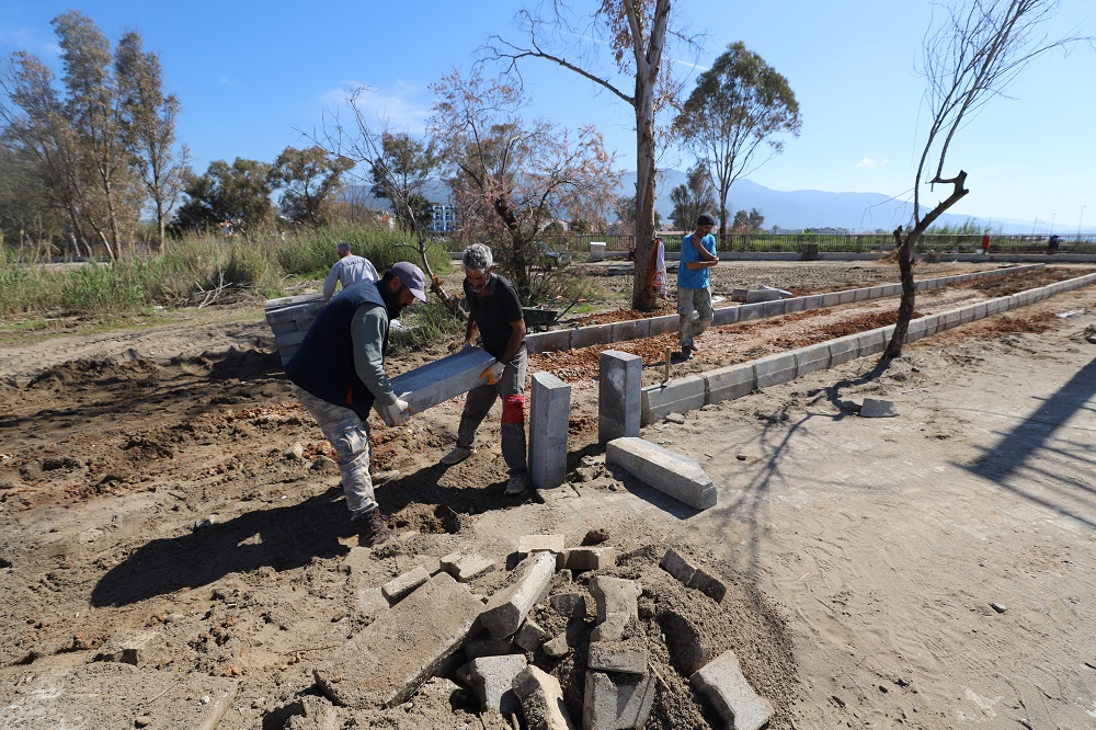 Menderes Belediyesi, Gümüldür’de sahil yürüyüş yolunu kaydırarak yeniliyor.