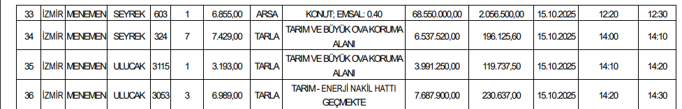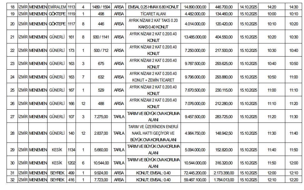 Söz konusu taşınmazların ihaleleri Menemen Belediyesi Meclis Salonu’nda 14 Ekim 2025 Salı ve 15 Ekim 2025 Çarşamba günleri saat 10.00 itibariyle gerçekleştirilecek.
