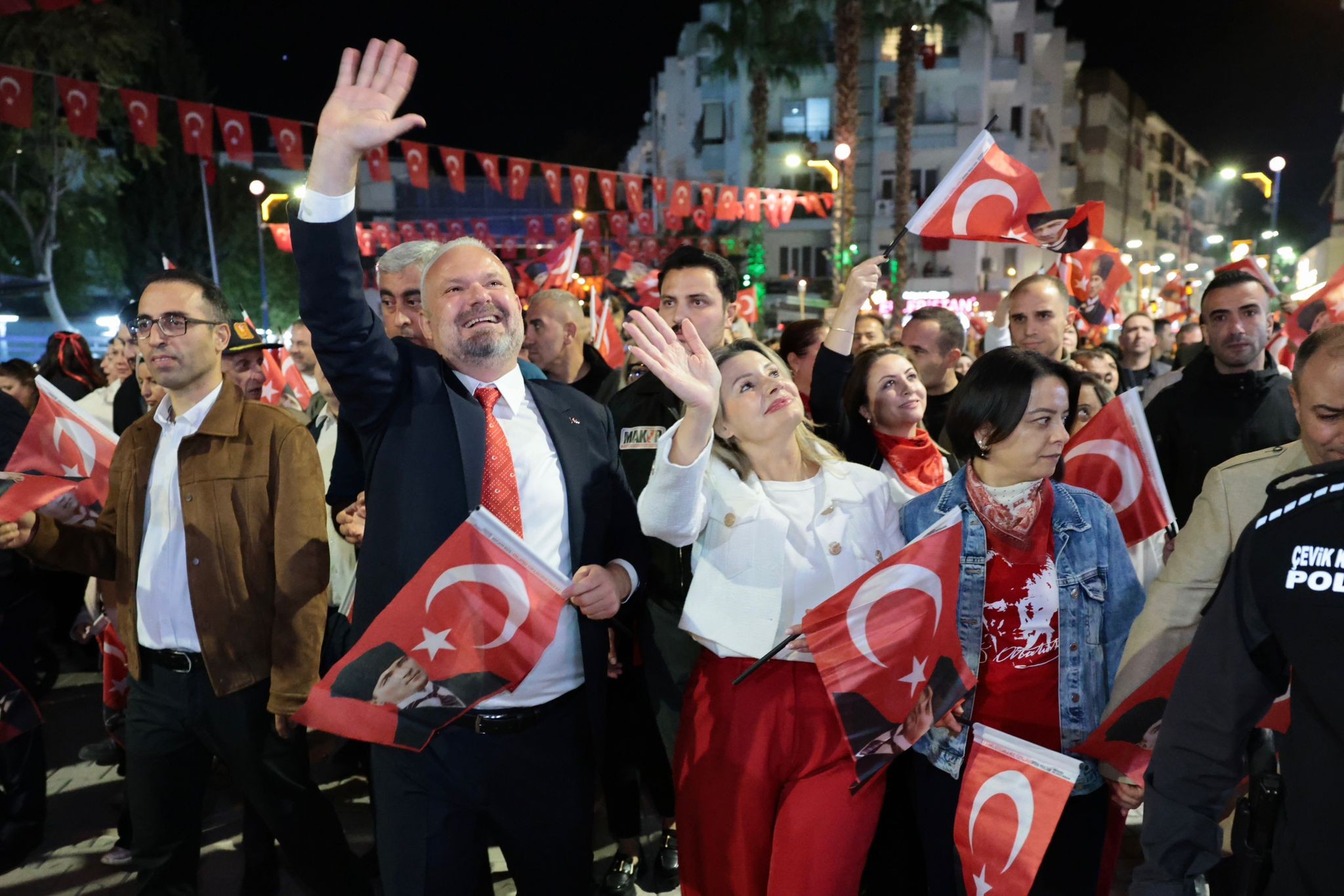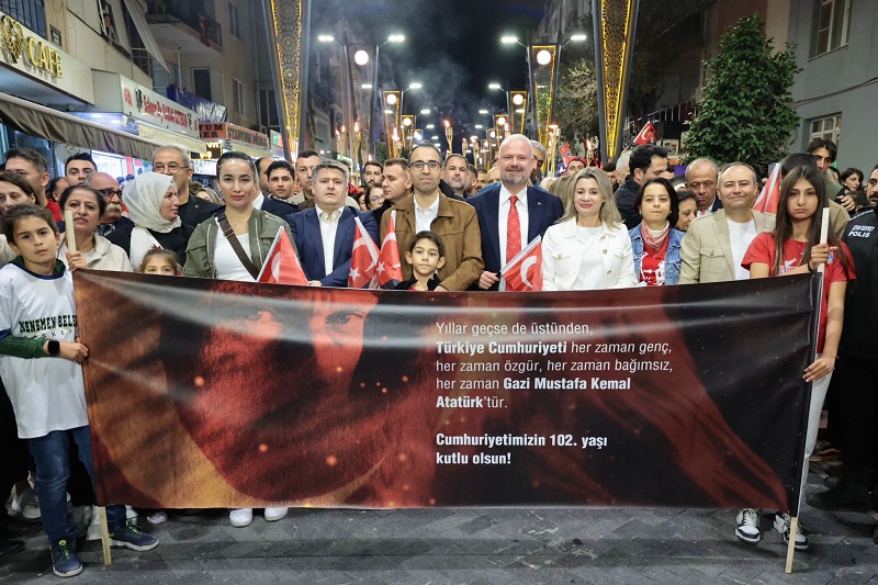 Menemen Stadı önünden başlayan ve Lise Yolu boyunca devam eden, Halil Alkaya Pazar Yeri'nin önünden geçerek Cumhuriyet Meydanı'na varılan yürüyüşün sonunda vatandaşlar Cumhuriyet marşlarıyla karşılandı. Hep birlikte marşların söylendiği ve Atatürk ile Kurtuluş Savaşı'ndan görüntülerin izlendiği gecenin finalinde Menemen Belediye Başkanı Aydın Pehlivan vatandaşlara seslendi.