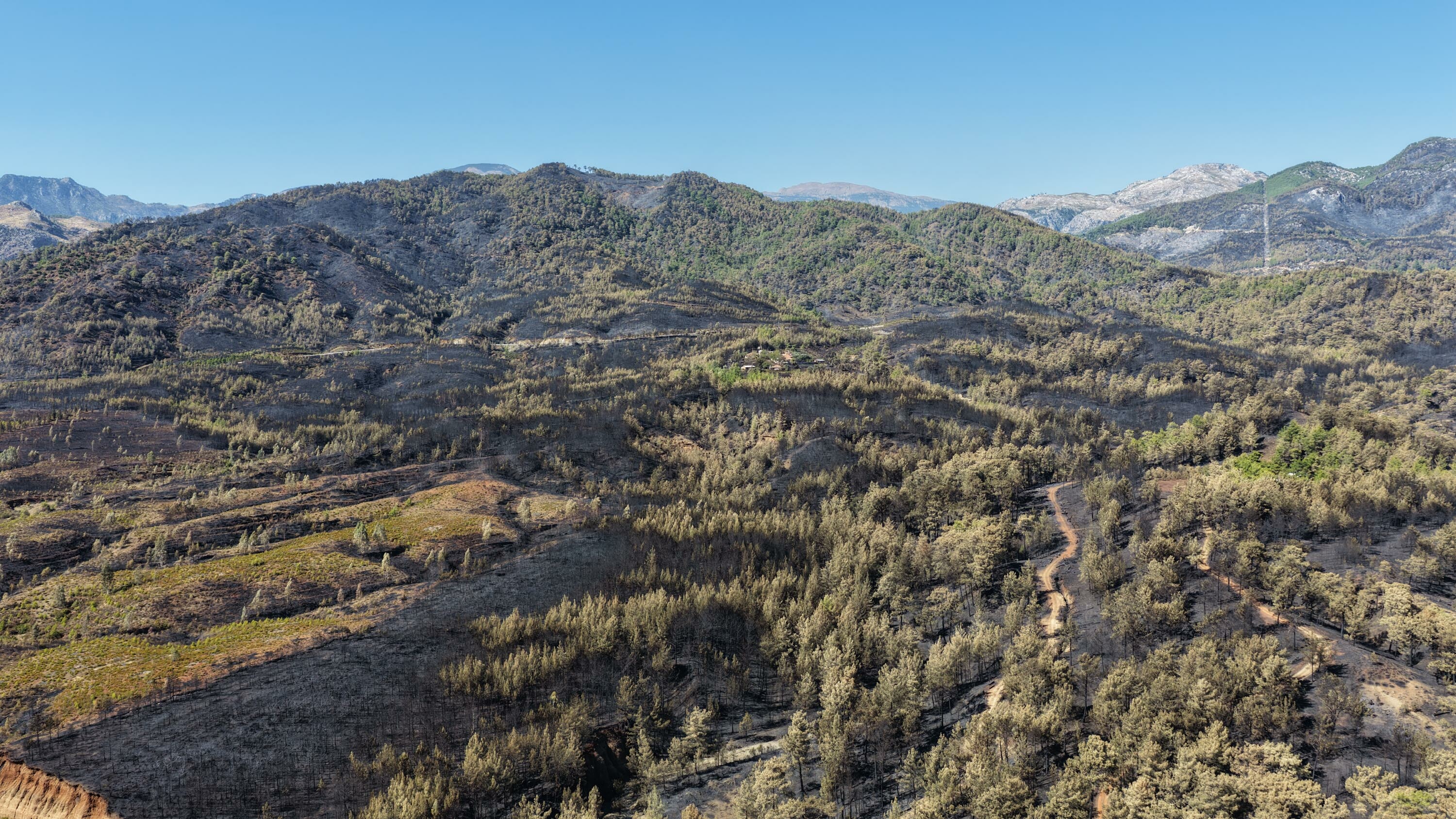 Muğla'nın Köyceğiz ilçesinde ekiplerin havadan ve karadan müdahalesiyle 63 saatte kontrol altına alınan orman yangınında alevlerin küle çevirdiği 3 bin hektarlık alan dron ile görüntülendi.