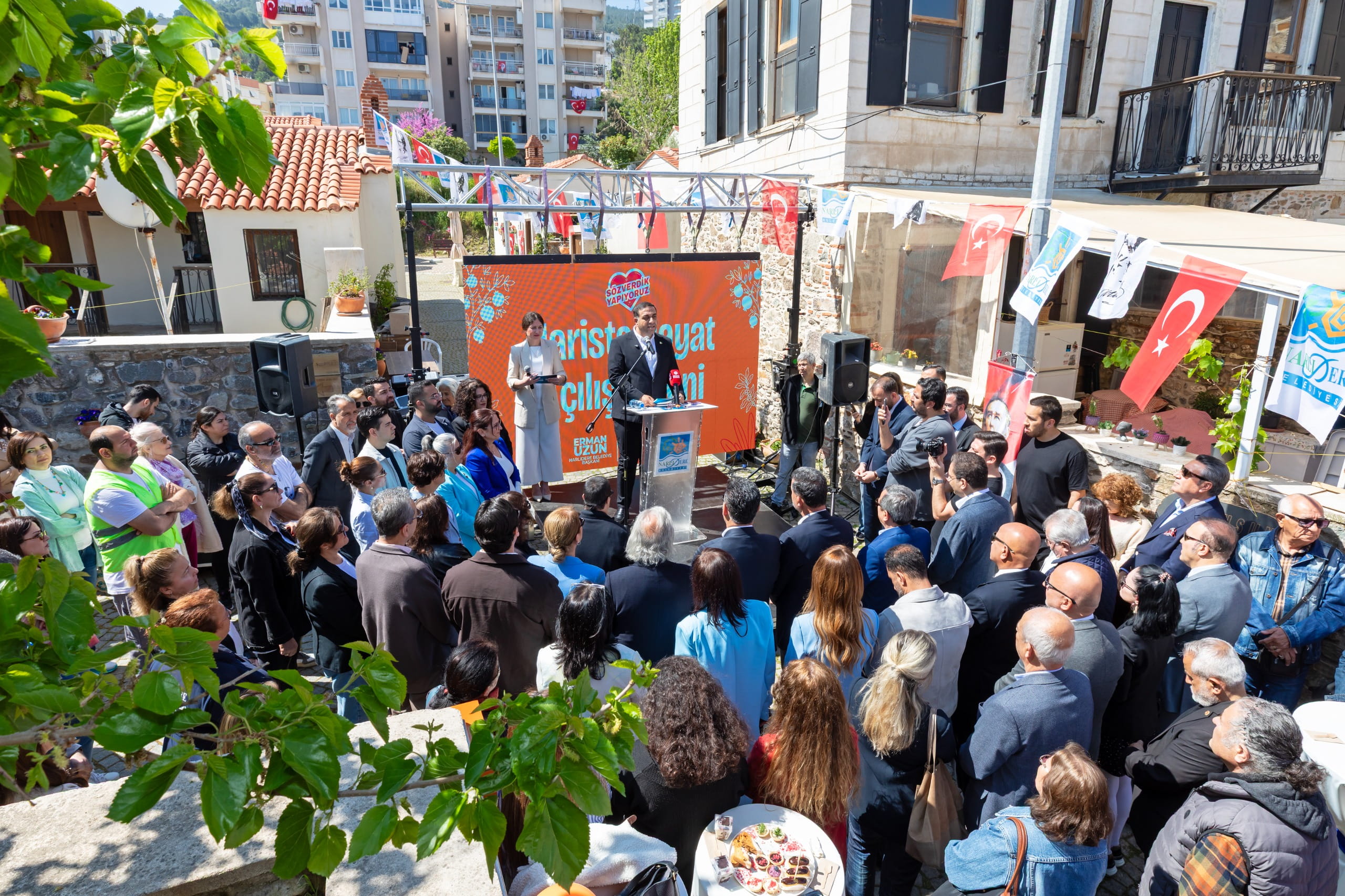 Narlıdere Belediyesi, çok sevilen sosyal tesisi Narista’nın yeni şubesi, Narista Hayat’ı Tarihi Yukarıköy’de açtı. Yoğun bir katılımla gerçekleştirilen açılışta konuşan Narlıdere Belediye Başkanı Erman Uzun, “Mazeret üretmiyoruz, iş üretiyoruz. Narista Hayat, Narlıdere’mize, İzmir’imize hayırlı olsun” diye konuştu. Başkan Erman Uzun açılış töreninde, düğün salonundan yeni kafelere, Limanreis Sahil Düzenlemesi’nden kent berberine kadar birçok yeni yatırımın da müjdesini verdi.