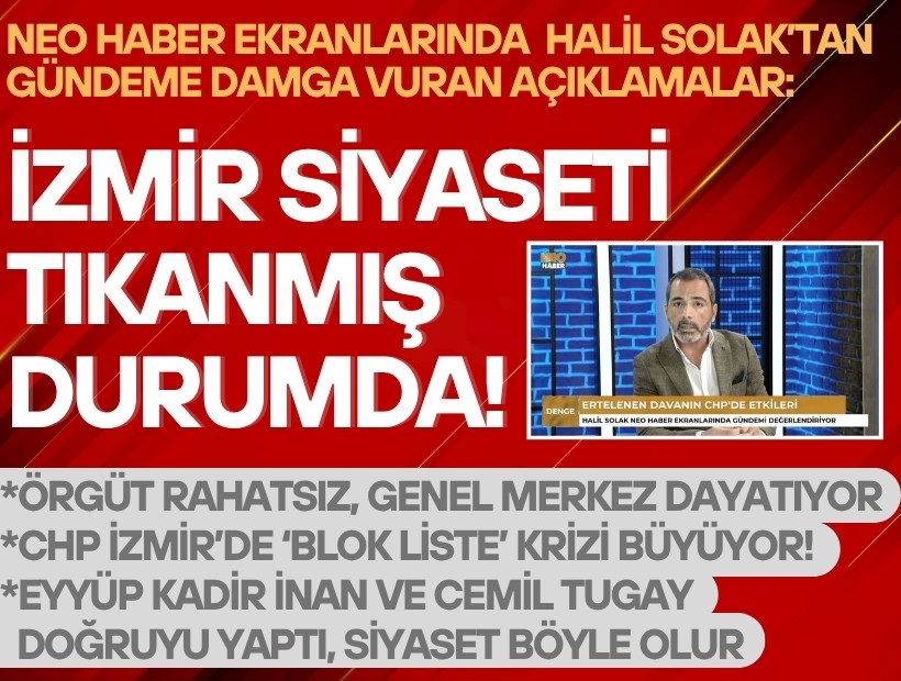 Ege Postası Genel Yayın Yönetmeni Halil Solak, Neo Haber ekranlarında yayınlanan Denge programında hem CHP içindeki gelişmeleri hem de İzmir siyasetinin mevcut durumunu değerlendirdi. Solak, parti içi rahatsızlıkları, kongre sürecinde yaşananları ve AK Parti cephesinden gelen çıkışları yorumladı. Programda yaptığı değerlendirmelerle siyaset kulislerine damga vurdu.