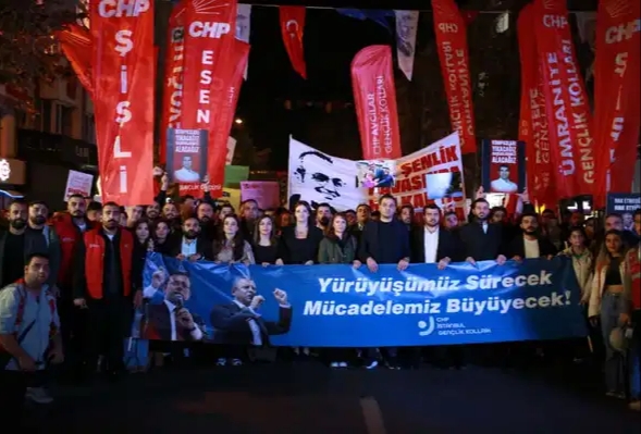 CHP İstanbul Gençlik Kolları üyeleri, Şişli Atatürk Evi Müzesi'nden Mecidiyeköy'e yürüyerek mitinge katıldı. Yürüyüşte tutuklu Şişli Belediye Başkanı Resul Emrah Şahan'ın özgürlüğü için sloganlar atıldı.