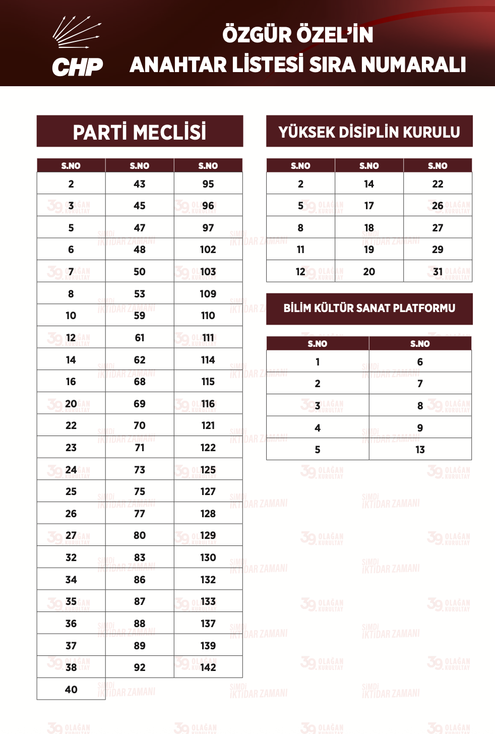 Listeler, okunmasının ardından basım için matbaaya gönderildi. Delegeler, CHP'de 80 kişilik PM üyeliği için en az 63 en fazla 70 isim işaretleyecek. 15 kişilik YDK için ise en az 14 isim işaretlenecek.