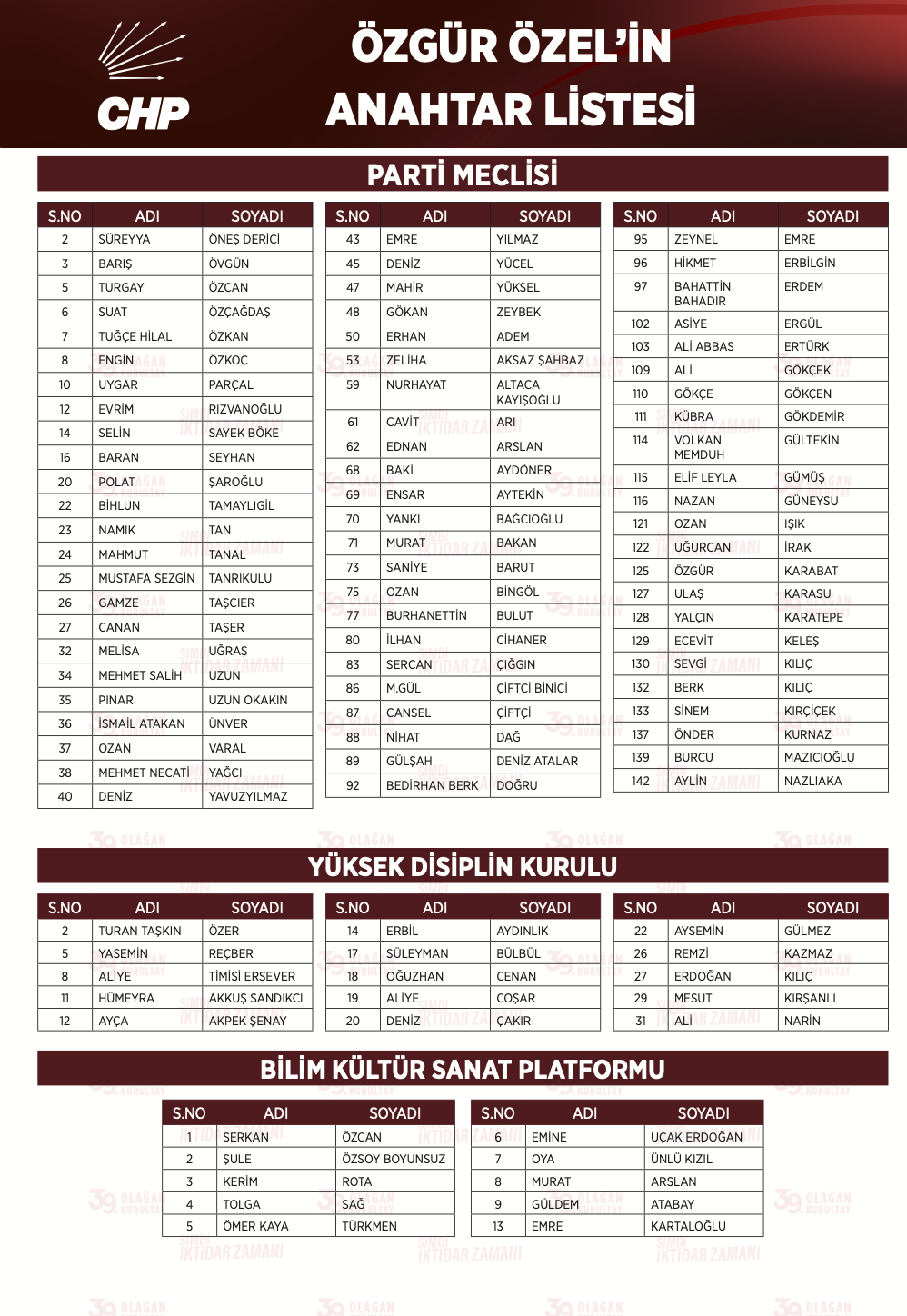 CHP’nin 39. Olağan Kurultayı’nda 145 kişi Parti Meclisi için aday oldu. CHP lideri Özgür Özel’in anahtar listesinde mevcut yönetimdeki 49 ismin korunduğu ve 31 yeni isim eklendiği öğrenildi. Listede Ozan Bingöl, Güldem Atabay, Şule Özsoy Boyunsuz ve İlhan Cihaner gibi isimler olduğu belirtildi.