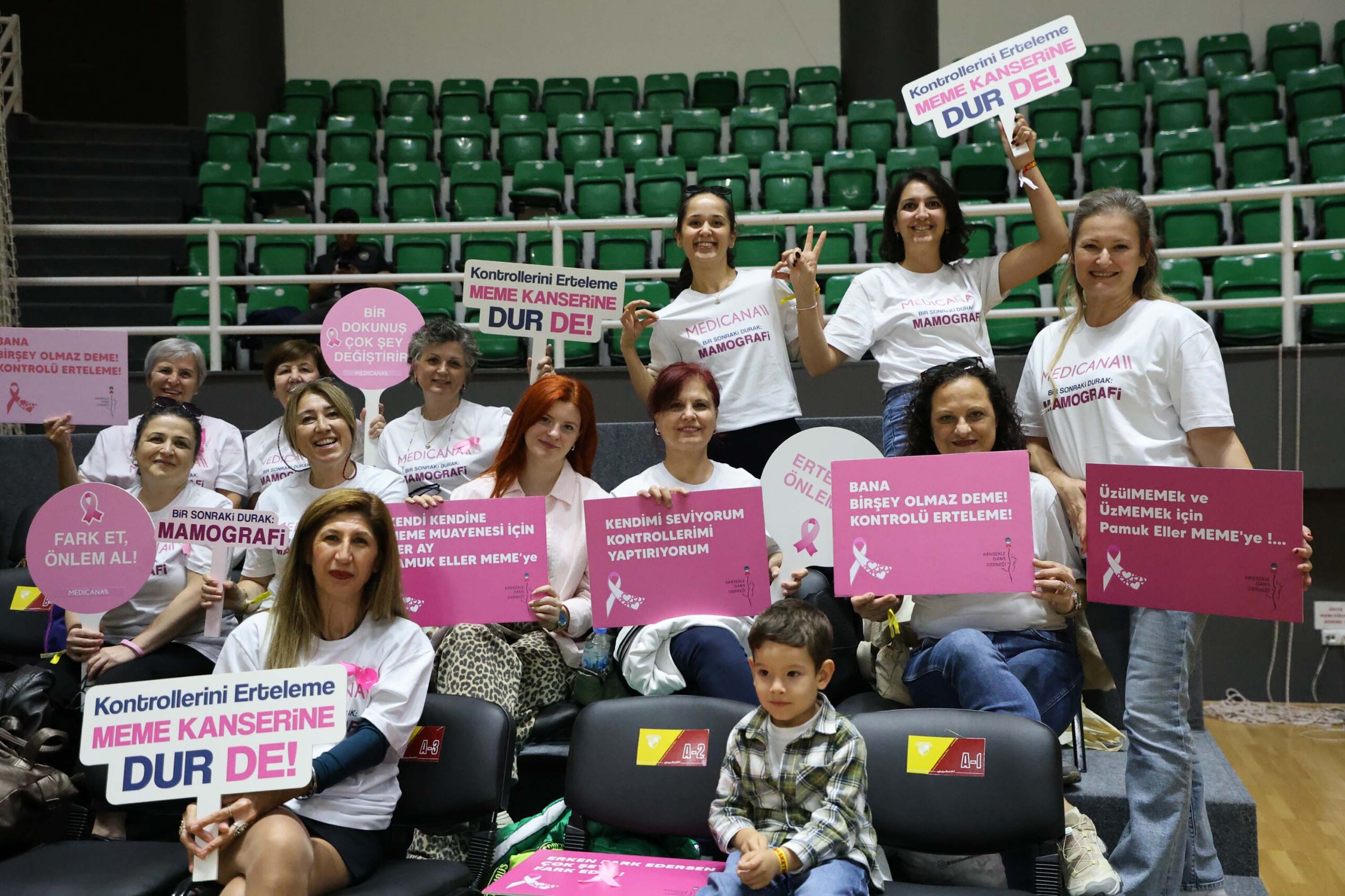 Meme Kanseri Farkındalık Ayı kapsamında kentin dört bir yanında 'Bir sonraki durak: Mamografi' kampanyasıyla farkındalık oluşturan Medicana International İzmir Hastanesi, bu kez kampanyayı parkeye taşıdı. İzmir'in simgelerinden Tarihi Bergama Vapuru'nda başlayan kampanya, deniz ulaşımıyla devam etmişti. Söz konusu kampanya, bu kez Medicana'nın sağlık sponsoru olduğu Göztepe'nin katkılarıyla parkede yankı buldu. Karşılaşmayı izlemeye gelen kadınlara meme kanseri farkındalığının simgesi pembe kurdeleleri dağıtan Göztepe Basketbol Takımı, parkeye ellerinde 'Mamografini yaptır, kontrollerini ihmal etme' yazılı pankartla çıkarak farkındalık mesajı verdi. Farkındalık çalışmasına, Darüşşafaka Lassa sporcuları da destek verdi. Pankartın açıldığı sırada spiker, 'Meme kanserinde erken teşhise giden yol, kendi kendine elle muayene, düzenli doktor kontrolü ve mamografiden geçer. Erken teşhis tedavide başarı şansını artırır. Mamografini yaptır, kontrollerini ihmal etme' dedi. Led ekranlardaki mesajlarla da kadın sporseverlere meme kanseriyle mücadelede erken teşhisin önemi hatırlatıldı.