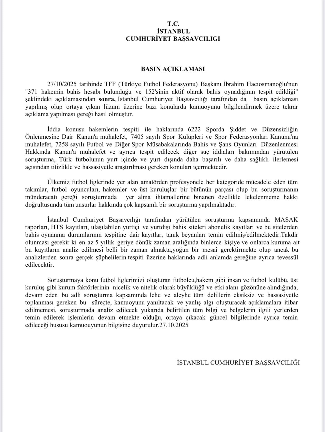 Savcılık konuyla ilgili yaptığı son açıklamada hakemlerin bahis oynamalarına ilişkin son 5 yıllık kayıtlarını inceleme altına alındığını duyurdu.