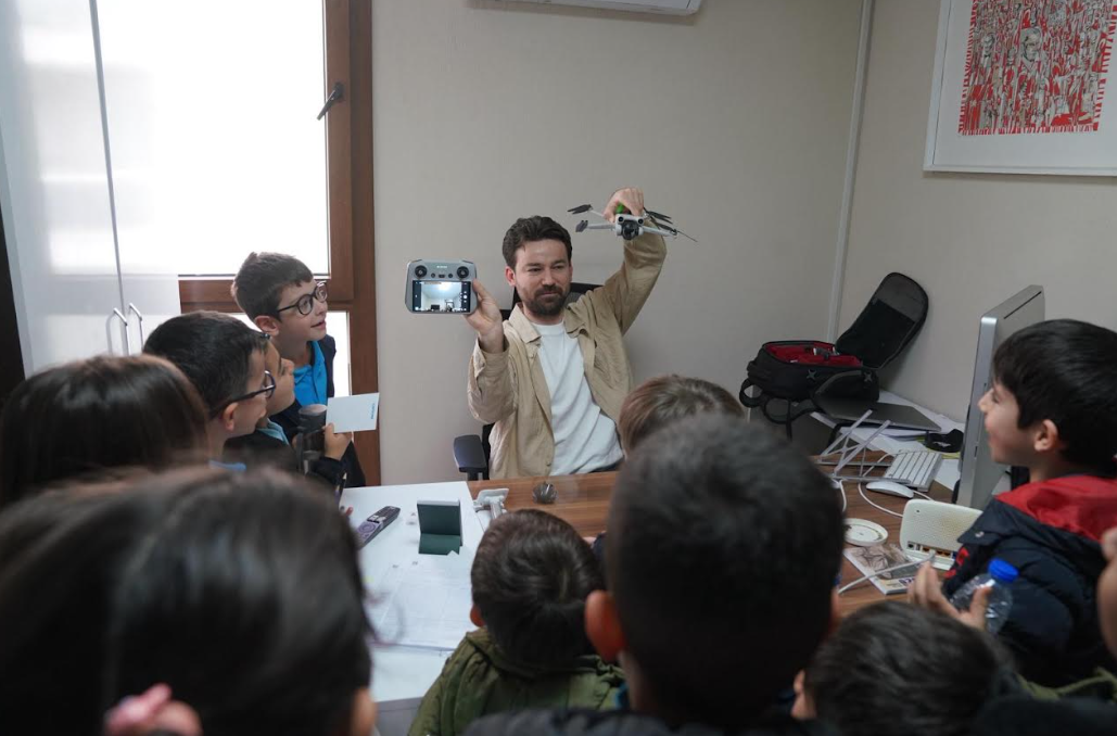 Özellikle Basın Birimi minik ziyaretçilerin yoğun ilgisiyle karşılaştı. Kamera ekipmanlarını yakından inceleyen, mikrofonları deneyen ve çekim süreçleri hakkında bilgi alan öğrenciler, en çok drone’a ilgi gösterdi.