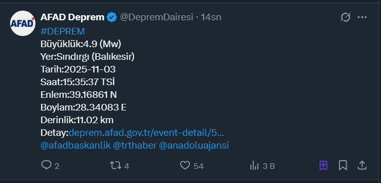 "Balıkesir ilimizin Sındırgı ilçesinde saat 15.35’de meydana gelen 4.9 büyüklüğündeki #deprem sonrası, an itibarıyla, olumsuz bir durum bulunmamaktadır. Saha tarama çalışmaları devam etmektedir."