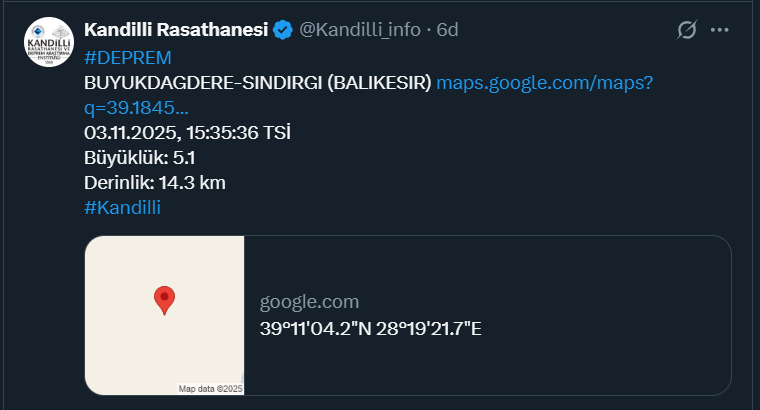 3.11.2025 saat 15:35’te Sındırgı Büyükdağdere‘de M5,1 büyüklüğünde bir deprem 11-13 km odak derinliğinde olmuş olmuştur. Bu deprem 27 Ekim 2025 günü 6,1 büyüklüğünde olan depremin beklenen en büyük artçı depremidir. Düzgün gidişe göre yörede bundan daha büyük bir artçı deprem beklemek şaşırtıcı olur. Ne var ki 5,1 depremi Sındırgı’daki yapı hasarlarını artırmıştır. Çünkü sındırgı‘nın kurulduğu Balıkesir yolu ile Akhisar yolu eski bir sazlık Kovalık bataklık ile göl yatağıdır. Buraya gelen sarsıntı dalgaları üçle dört kat büyütülerek üst yapıya yansıdığı için hasar oranı artmaktadır. Ayrıca yapılar rezonansa gelmektedir. Bu depremlerde yapılarda kolon kesmeleri ve giriş kat üzerine yapı görüşmeleri görüldüğü gibi yer yer sıvılaşma olaylarıyla da karşılaşılmıştır. Kırık güneydoğuya doğru ilerlemektedir. Olabilecek daha büyük bir depremde Sındırgı çok daha büyük bir hasar olabilir. Sındırgı‘ın bir an önce eski bataklık alanından alınıp TOKİ konutlarının olduğu güneydoğu‘daki alana kaydırılması ivedilikle gereklidir.