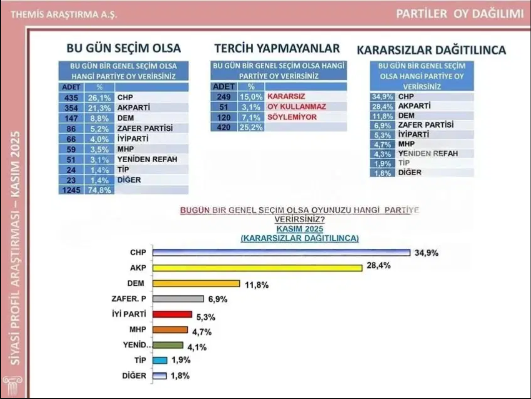 THEMİS Araştırma, 18-27 Kasım tarihleri arasında 15 ilde yaptığı kamuoyu yoklamasının sonuçlarını paylaştı. CATI yöntemiyle gerçekleştirilen araştırmada seçmenlere oy tercihleri, siyasi kimlik tanımları, ülkenin temel sorunları ve hukuk sistemine güven başlıklarında sorular yöneltildi.