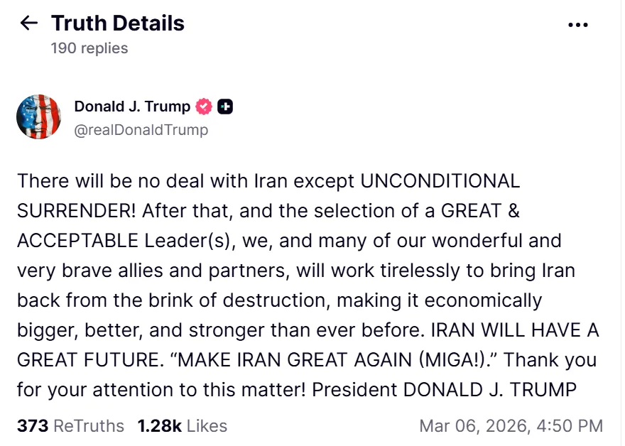 Trump, sosyal medya hesabından yaptığı "İran ile, kayıtsız şartsız teslimiyet dışında hiçbir anlaşma olmayacak! Bundan sonra ve büyük, kabul edilebilir bir liderin/liderlerin seçilmesinin ardından; biz ve çok sayıda harika, son derece cesur müttefikimiz ve ortağımız, İran’ı yıkımın eşiğinden geri getirmek için yorulmadan çalışacağız. İran’ı ekonomik olarak her zamankinden daha büyük, daha iyi ve daha güçlü hâle getireceğiz. İran’ın harika bir geleceği olacak. İRAN’I YENİDEN BÜYÜK YAPIN (MIGA!). Bu konuya gösterdiğiniz ilgi için teşekkür ederim!" açıklamasıyla İran'la arabuluculuk ihtimalinin olmadığını duyurdu.