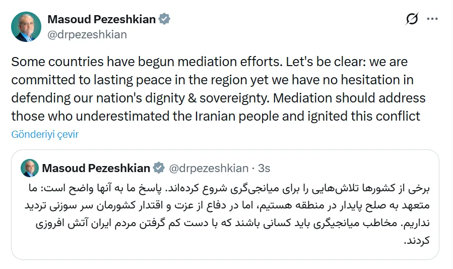 İran Cumhurbaşkanı Pezeşkiyan, "Bazı ülkeler arabuluculuk çabalarına başlamıştır. Açık konuşalım: Bölgede kalıcı barışa bağlıyız, ancak ülkemizin haysiyetini ve egemenliğini savunmaktan çekinmiyoruz. Arabuluculuk, İran halkını hafife alan ve bu çatışmayı ateşleyenlere yönelik olmalıdır." açıklamasıyla arabuluculuk çağrılarına açık olduklarının sinyallerini vermiş, Ortadoğu'da kalıcı bir barış istediklerini dile getirmişti.