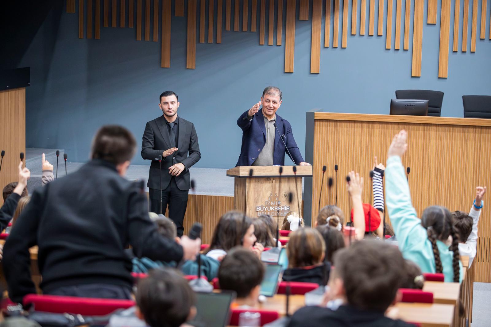 İzmir Büyükşehir Belediye Başkanı Dr. Cemil Tugay, İzmir Çocuk Meclisi’nin yeni döneminin açılışı nedeniyle düzenlenen toplantıda 9-14 yaş arası üyelerle bir araya geldi. Başkan Tugay, “Sizlerin içinden belediye başkanları, milletvekilleri çıkacak. Sizler çok önemli konumlara geleceksiniz. Doğruların yapılması için mücadele etmeyi tercih etmeniz lazım. Ne iş yaparsanız yapın bilime göre davranmanız lazım” dedi.