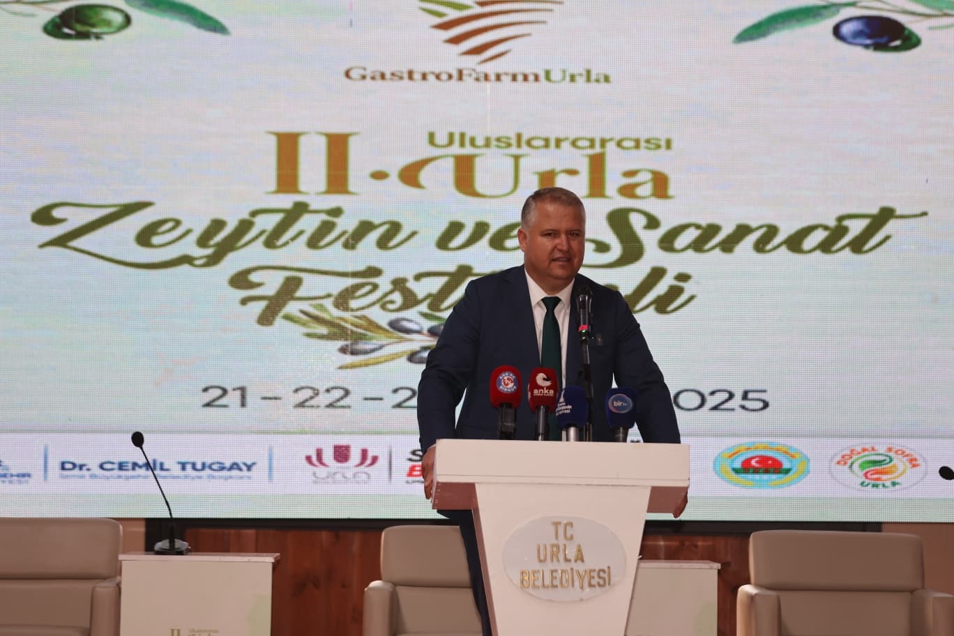 Uluslararası Zeytin ve Sanat Festivali’nin hem zeytinin kalitesini hem de bu coğrafyanın ruhunu, Urla’nın kendine özgü kültürünü daha geniş kitlelere duyurmak için bir fırsat sunduğunu belirten İzmir Büyükşehir Belediye Başkanı Cemil Tugay konuşmasında “Zeytincilik, İzmir için herhangi bir tarım faaliyeti olmanın ötesinde bir değerdir. Kentimizin karakteri, halkın emeği, sofrasının bereketi ve kadim kültürünün de aslında hafızasıdır. İklim koşullarının zorlaştığı, maliyetlerin arttığı şu dönemde toprağından kopmayan üreticilerin de direnişidir zeytin. Zeytin, Akdeniz'in her ülkesinde özel bir yere sahip: İspanya'da Endülüs, İtalya'da Toskana, Yunanistan'da Girit. Bu bölgeler yalnızca iyi üretim yaptıkları için değil, ürünlerine bir hikâye kattıkları, güçlü markalar oluşturdukları için bugün dünyada biliniyorlar. Bizim de zeytin konusunda köklü bir kültürümüz, çok büyük bir üretim kapasitemiz ve gücümüz var. Ama markalaşma ve pazarlama konusunda ne yazık ki hak ettiğimiz potansiyeli ortaya koyamadığımızı hepimiz görüyoruz. Bir ürünün hak ettiği değere ulaşması için yalnızca üretmek yetmiyor; o ürün için bu yeterli değil. Görünür kılmak, dünyaya bu hikâyeyi paylaşmak gerekiyor. İşte tam bu yüzden bu festival ve bunun gibi festivaller çok önemli. Hem zeytinimizin kalitesini hem de bu coğrafyanın ruhunu, Urla'nın kendine özgü kültürünü daha geniş kitlelere duyurmak için bir fırsat sunuyor" dedi.
