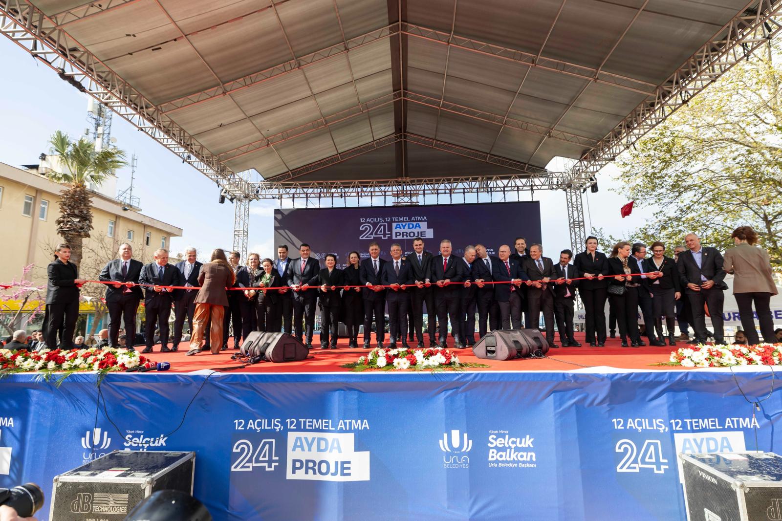 Konuşmaların ardından hep birlikte kurdele kesilerek açılışlar gerçekleştirildi. Törende Urla Belediyesi tarafından yapımı tamamlanan kreş, sosyal alan, çevre düzenlemesi, kapalı pazaryeri, halı saha, semt evi, atık getirme merkezi, kıyı düzenlemesi gibi 12 projenin açılışı yapılırken, kapalı spor salonu, kültür merkezi, hayvan barınağı, otopark, sosyal merkez, mesire alanı, kreş, kıyı ve çevre düzenlemeleri gibi 13 projenin ise temeli atıldı.