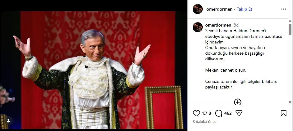 Dormen’in vefatını oğlu Ömer Dormen, sosyal medya İnstagram hesabından yaptığı paylaşımla duyurdu.