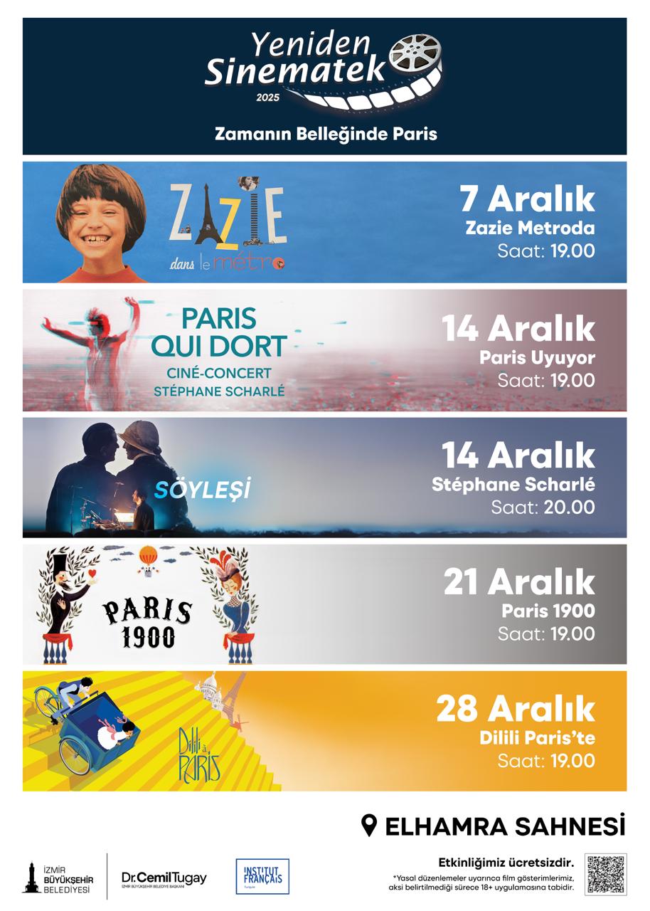 İzmir Büyükşehir Belediyesi’nin Yeniden Sinematek gösterimleri, yılın son ayında “Zamanın Belleğinde Paris” seçkisi ile sinemaseverlerin karşısında çıkıyor. Absürt komediden bilim kurguya; belgeselden animasyona farklı türlerden filmlerin yer aldığı ve Institut Français iş birliği ile düzenlenen program kapsamında, film gösterimlerinin yanı sıra müzisyen Stéphane Scharlé’in katılımıyla bir sinema konser etkinliği ve söyleşi de gerçekleştirilecek. Aralık ayı boyunca her pazar saat 19.00’da Elhamra Sahnesi’nde düzenlenecek ücretsiz gösterimler, sinema seyircisini Paris’e yolculuğa çıkaracak.