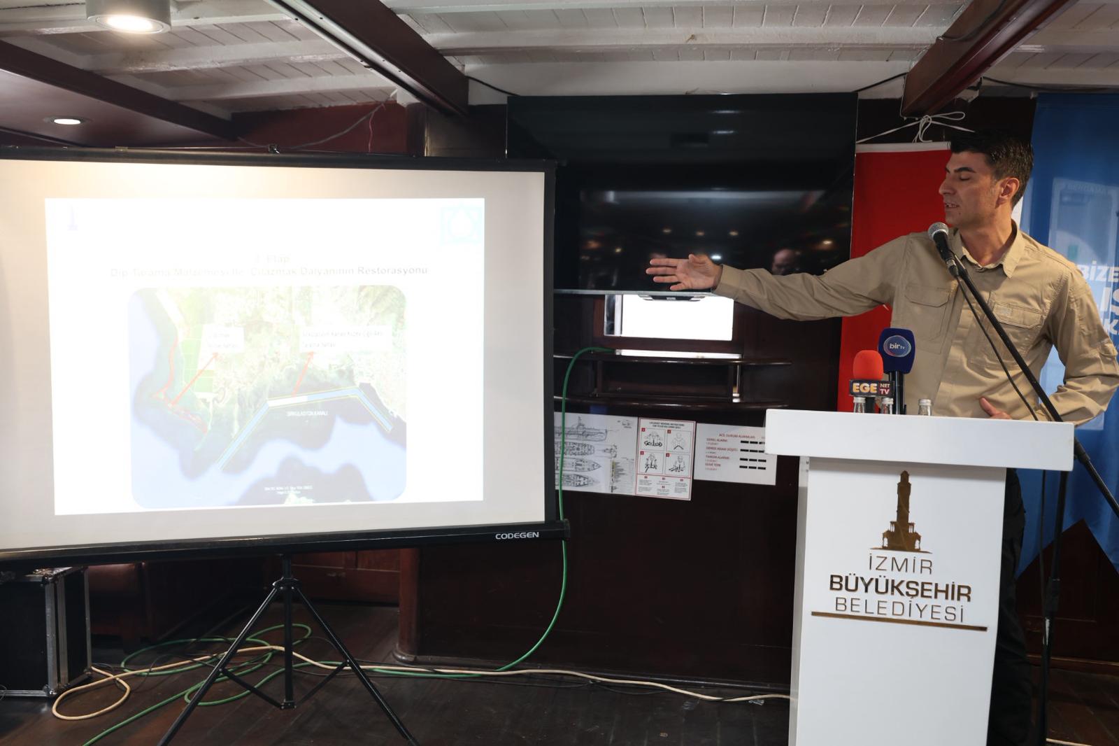 İZSU Genel Müdürü Gürkan Erdoğan, 2000 yılından bu zamana kadar İzmir Körfezi’ni izlediklerini belirterek, “Bunun yanında İzmir Körfezi’ni anlatmak gerekirse, hemen hemen akıntı hiç yok. Hem 3 buçuk milyon insanın yarattığı kirlilik baskısı var hem de akıntısı yok. İzmir Körfezi’nde her yıl kirlilik değerlerinin he durumda olduğunu izliyoruz ve kamuoyu ile paylaşıyoruz. Kirlilik baskısı ve akıntı hızının yavaş olduğu sorunlarından bahsetmiştik. İzmir Körfezi’ne giren İzmir Körfezi’nde kalıyor. 2 tane büyük ihale yaparak 5 milyon metreküp tarama yaptık. Kentin birçok yerinde yağmur suyu ayrıştırma çalışmalarımız sürüyor. 33 deremizin tamamında temizlik çalışmaları yapılıyor, 100 bin tona yakın atık çıkartılıyor” ifadelerine yer verdi.